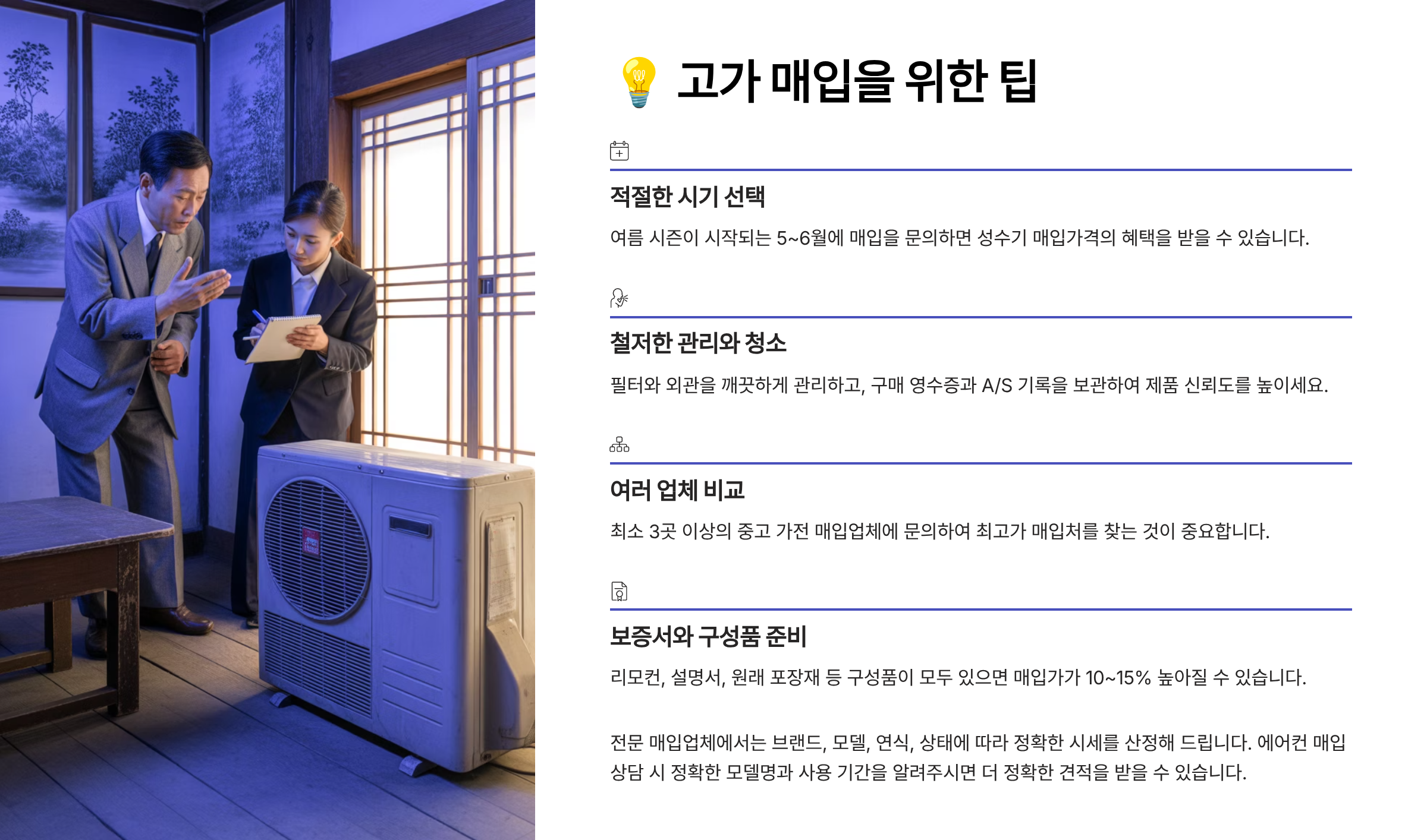 ✔ 리모컨, 설명서, 부속품을 함께 준비해두세요. ✔ 필터 청소 등 간단한 관리만 해도 상태 평가가 달라져요. ✔ 브랜드와 연식, 설치 형태를 정확히 알려주면 빠른 상담과 고가 매입이 가능해요.
